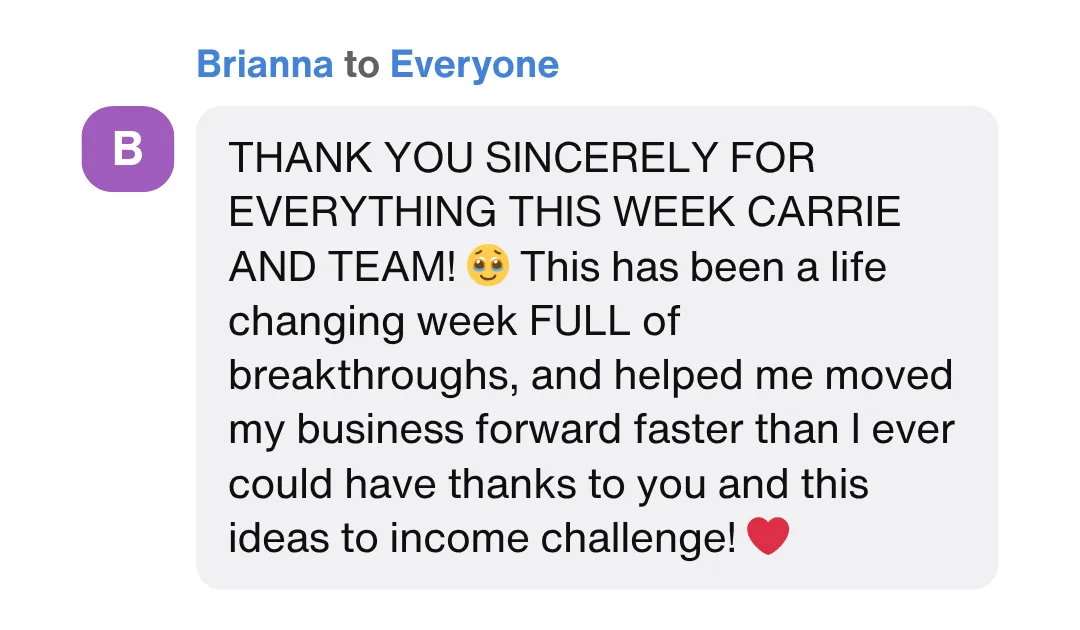 Over 130,000 women have taken the Ideas to Income Challenge and the feedback has been incredible… people having breakthroughs in just a few days