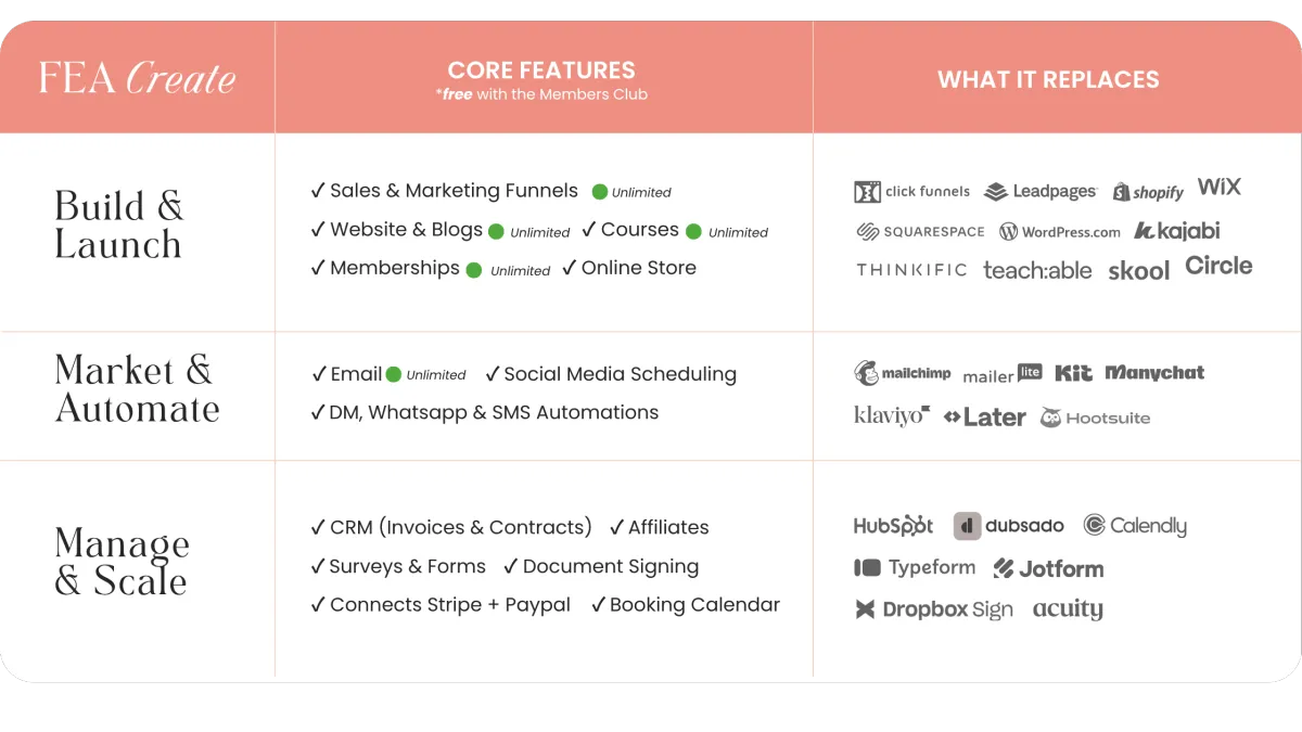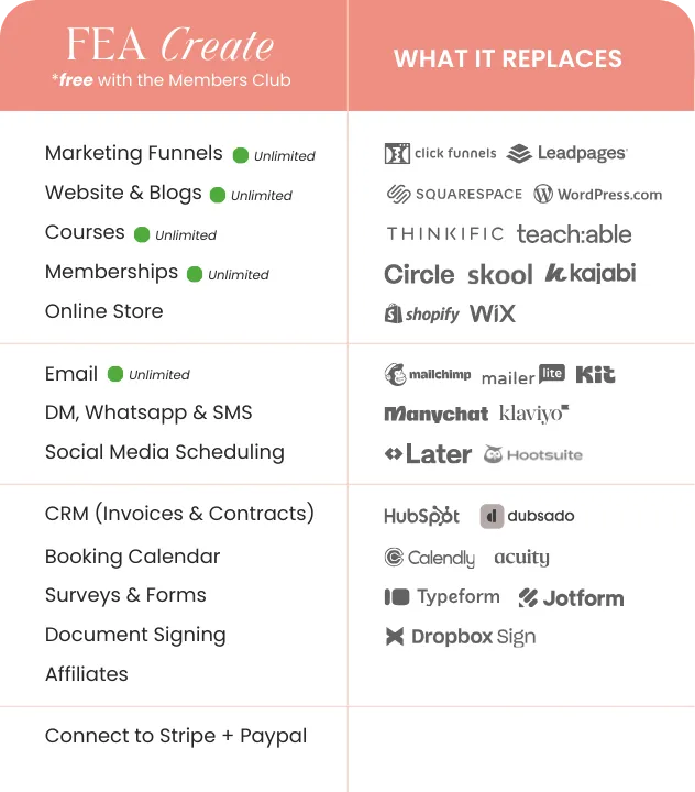 It’s our all-in-one tech platform (our white-label version of Go High Level), included free with your membership. With FEA Create you can build your website, funnels, courses, memberships, automate emails and DMs, take payments, run a CRM, and more. It replaces platforms like Kajabi, ClickFunnels, Mailchimp, and Hubspot, saving you hundreds every month.