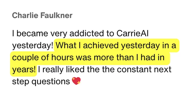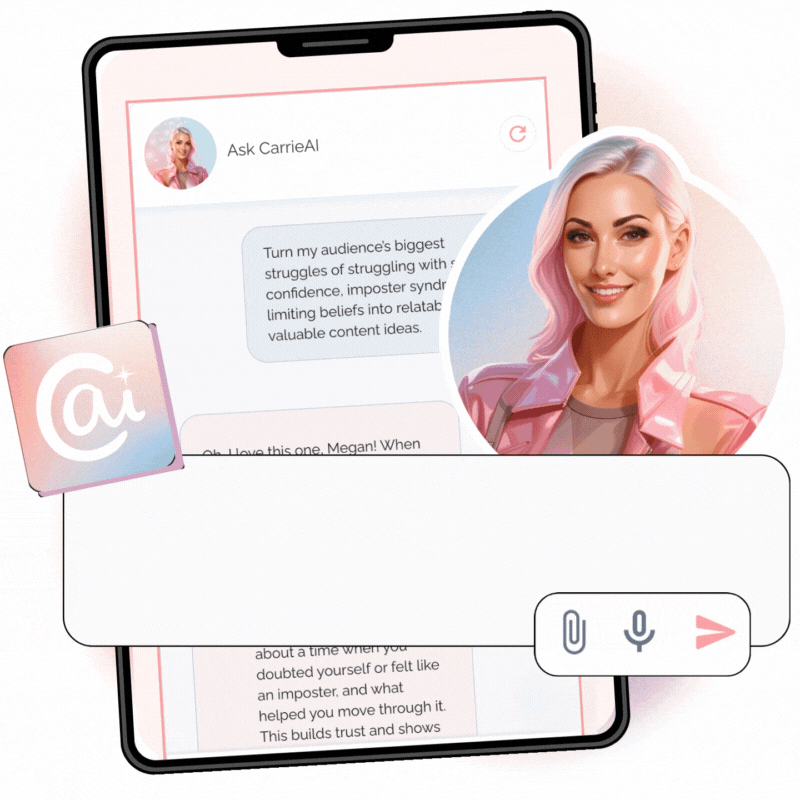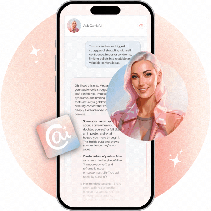 With CarrieAI, you get your own business coach, copywriter, and marketing strategist, all in one magical AI, trained on our proven $10K Month Game Plan that’s helped 40,000+ women over the past decade.